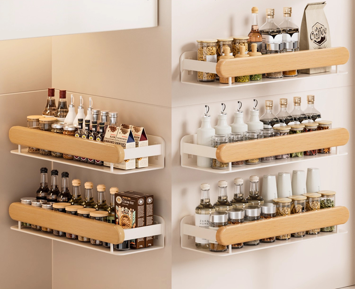 벽걸이형 랙은 스토브 위나 싱크대 옆 벽에 직접 설치되어 조미료 병을 카운터에서 완전히 떼어 놓을 수 있습니다. 좁은 조리대가 있는 작은 주방의 경우 이 디자인을 사용하면 도마나 작은 냄비를 놓기에 충분한 조리대 공간을 30~50% 확보할 수 있습니다. 그러나 고려해야 할 사항도 있습니다. 예를 들어 벽이 타일이나 건식벽체로 만들어진 경우 설치가 안정적일까요? 대부분의 벽걸이형 랙에는 강력한 접착 나사나 확장 나사가 함께 제공됩니다. 접착식 랙은 매끄러운 타일 벽에 적합하며 2~3kg의 무게를 견딜 수 있으며, 확장 나사는 건식 벽체에 더 적합하므로 더 무거운 조미료 병을 사용해도 랙이 떨어지지 않습니다. 또한, 벽걸이 선반은 적당한 높이에 설치해야 합니다. 너무 높으면 양념을 넣기가 불편하고, 너무 낮으면 가스렌지의 배기를 막을 수 있습니다. 일반적으로 쉽게 접근할 수 있도록 스토브 위 50-60cm 높이를 권장합니다.